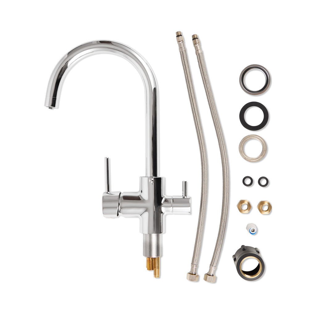 The Deante Swan Neck 3 Way Filtered Water Tap features a classic, curved swan-neck spout with chrome finish making it a timeless addition to any kitchen.